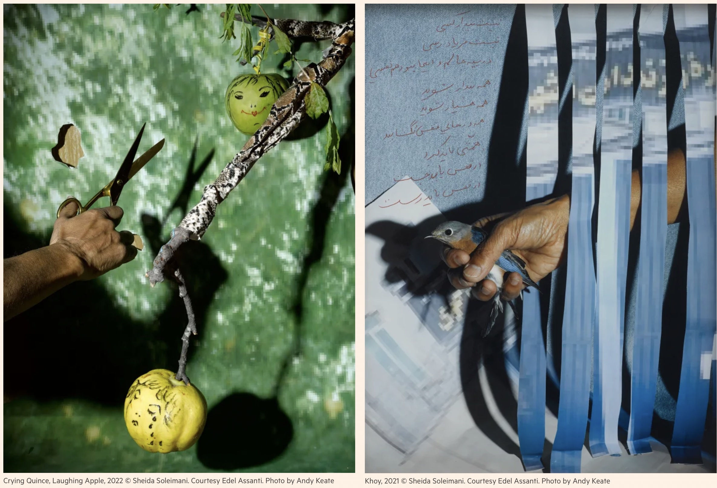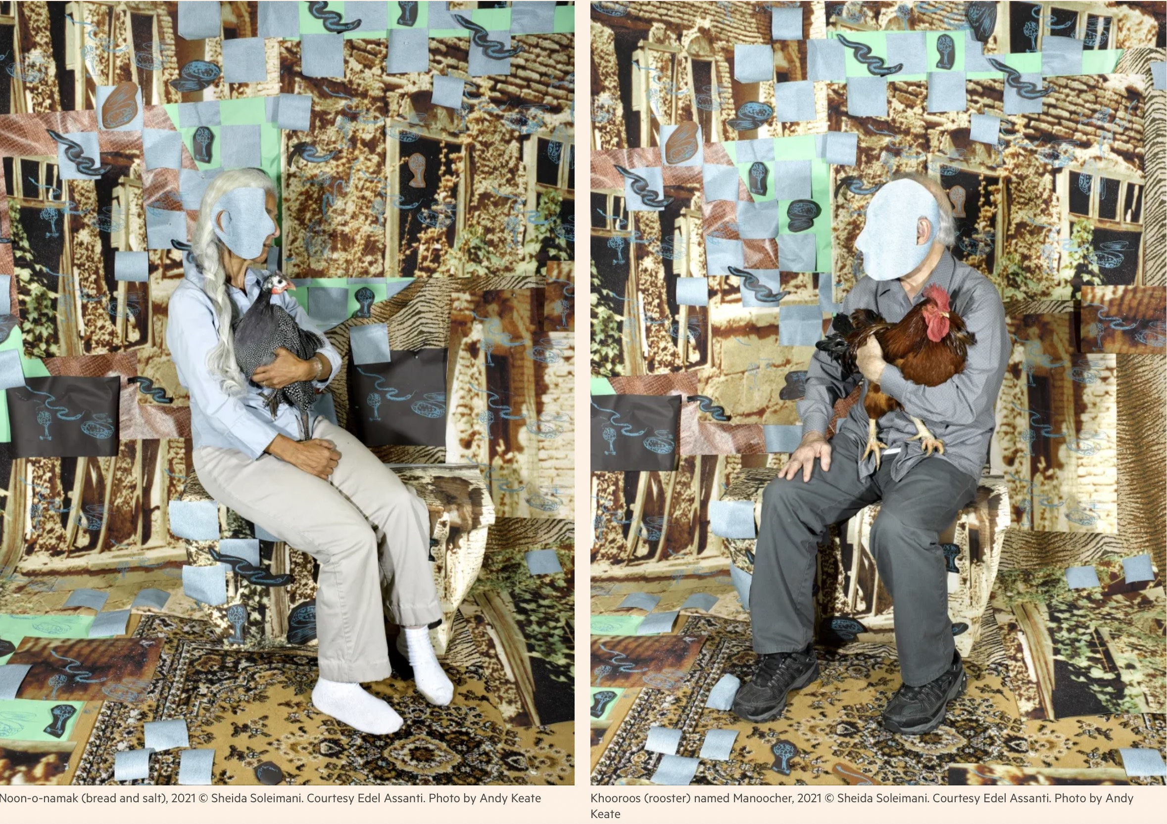 Sheida Soleimani sits with me in the back of a gallery in Tribeca, New York. Behind us are some pieces of her earlier work, but we're gazing, on a laptop, at images of her newest. Specifically, we're looking at a photograph she took of her mother, sitting on a bench, in loose chinos and socks. You can't see her face; it's covered. She's holding a live guineafowl. Like much of Soleimani's work, the scene is hard to describe - part collage, part sculpture, part set design. She constructed it in her studio out of layers and layers of actual stuff: blue paper squares pinned to the wall in an imperfect grid; her mother's sketches of snakes and trees and bread screen-printed and pinned up. There's animal print, there's a Persian carpet and, in the middle, there's her mother. This is Soleimani's style: she builds a set, then photographs the scene with a wide depth of field. Because everything is in focus, it's hard to tell what's "real". The resulting images look almost Photoshopped, but they're not. Most prominent in this montage of memories is the one of a dilapidated house in Shiraz, Iran. This is definitely real: it used to be her mother's. Soleimani's parents fled Iran in the 1980s, after the Islamic revolution. Both were pro-democracy activists who couldn't stay. Her father was in hiding for nearly three years, then hired smugglers to guide him through the mountains to Turkey on horseback. When her mother tried to follow, she was caught at the border, imprisoned for over a year and put in solitary confinement.