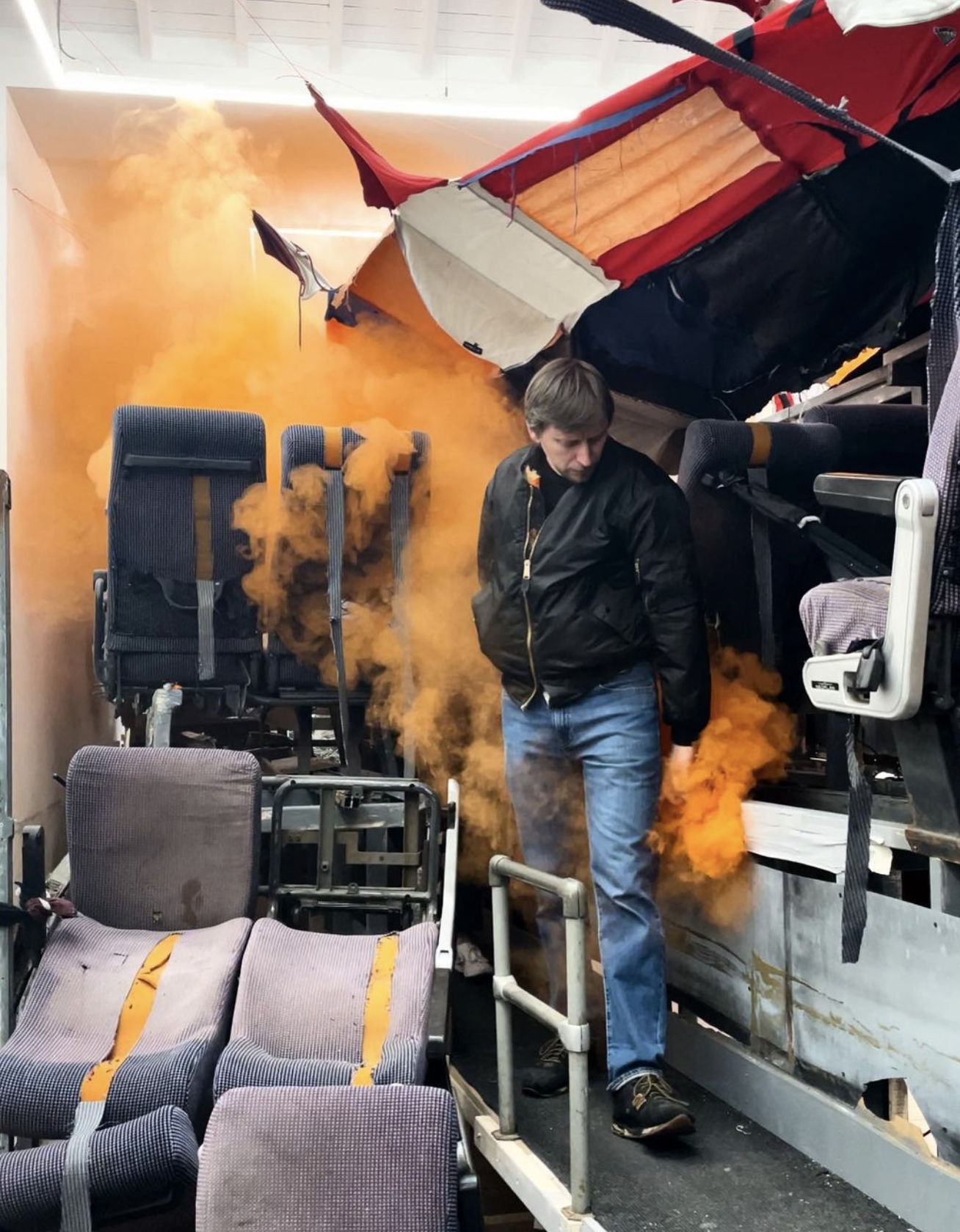 Marcin Dudek’s solo exhibition launched with a bang – well, technically a three-minute smoke grenade intervention, using flares synonymous with football fans. Neoplan is an immersive exhibition that pulls from Dudek’s past as a member of one of the most violent football gangs in Poland. His fascination with the sport, but mainly with crowd psychology, swells into the space in the physical form of a decommissioned, dilapidated bus, which channels the tension of a football fan club journeying to a rival city. Accompanying the immersive installation are Dudek’s collages, which continue his exploration of football, players, and its fans.