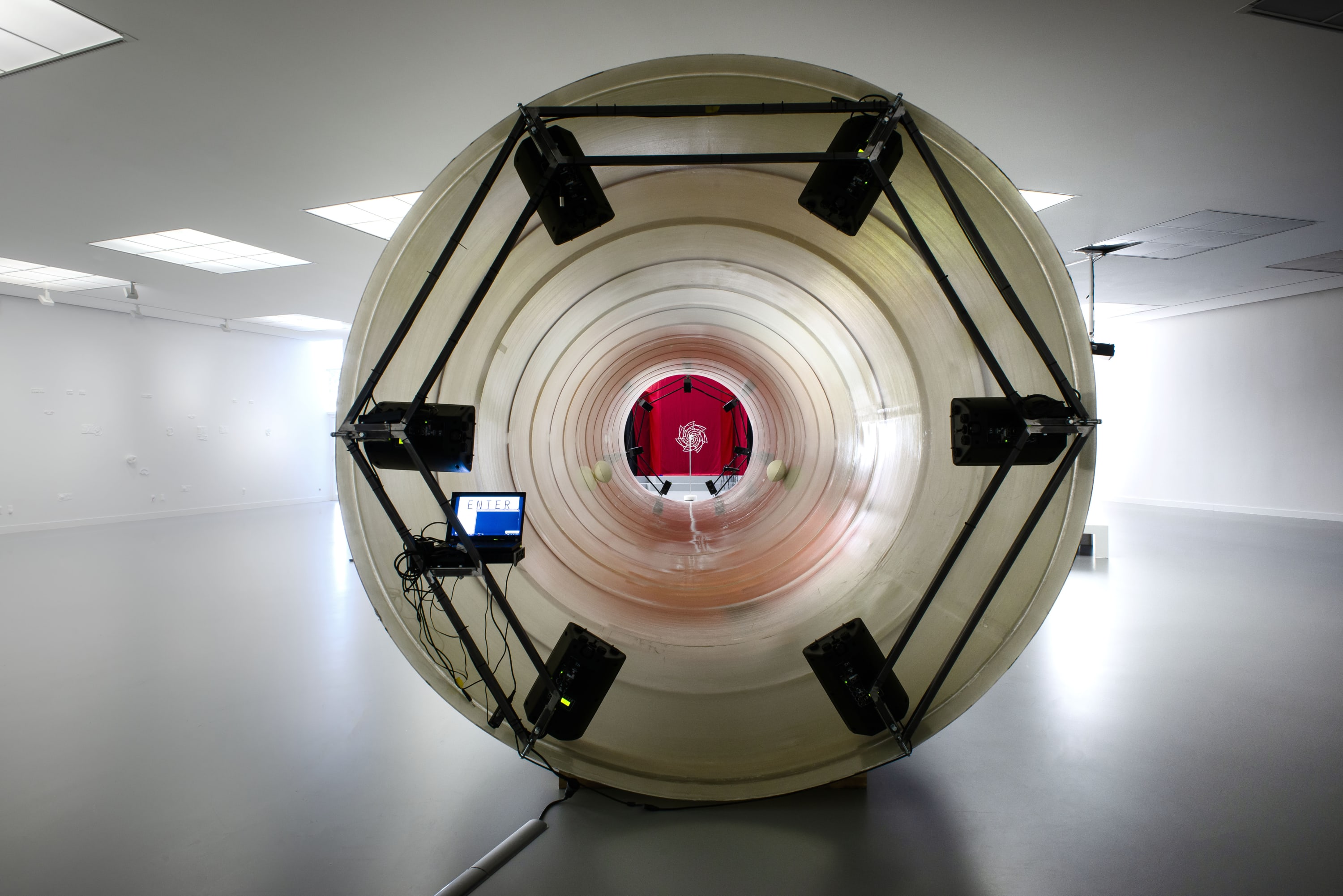 Haseeb Ahmed, The Wind Egg Incubation Tunnel, 2018, Fiberglass, steel, composition, custom software, electronics, 3D prints, cast plastic, 4 x 4 x 14m, Installation view at M HKA, Antwerp, Belgium, 2018 -